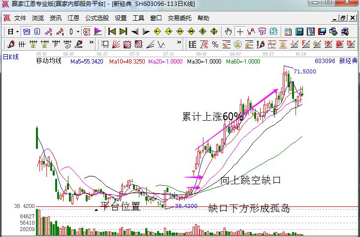 上面是新經(jīng)典的近期日K線走勢圖,技術(shù)形態(tài)上,股票在前期下跌形成了一個底部區(qū)間平臺,而這個平臺的整理周期近3個月,而股票在今年的8月14日的那一天高開形成向上的跳空缺口,缺口幅度達(dá)到了8%,缺口下方就形成的孤島特征,所以符合底部孤島模型,