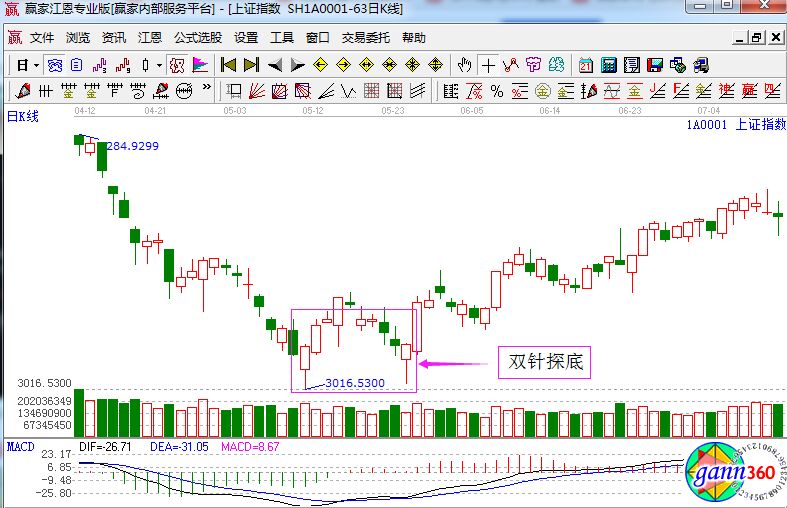 雙針探底信號強,影線越長頭越昂;頂部出現(xiàn)射擊星,手中籌碼趕快清;