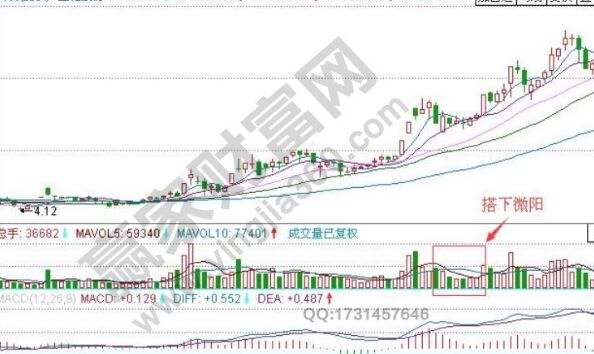 價(jià)格經(jīng)過(guò)下跌或橫盤(pán)整理之后,在下跌或橫盤(pán)末期,由于買(mǎi)盤(pán)的進(jìn)入導(dǎo)致開(kāi)始放量。在放量時(shí),5日成交量均線被抬高,隨后一般會(huì)進(jìn)行數(shù)日的強(qiáng)制調(diào)整,在調(diào)整期間,成交量明顯減少,使得5日成交量均線自上向下搭。拋壓變小后,價(jià)格會(huì)再向上攻擊,當(dāng)發(fā)現(xiàn)只用很少的量就能將K線打成陽(yáng)線后, 表明了持股者惜售的心情,之后大幅拉升馬上開(kāi)啟。因此,投資者一發(fā)現(xiàn)“搭下微陽(yáng)”成交量組合出現(xiàn),應(yīng)立即以市價(jià)買(mǎi)入該股,等待享受拉升的快樂(lè)。