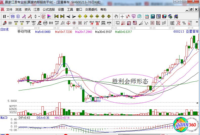 上圖中亞星客車在經(jīng)過了一段時間的下跌行情后,它的均線指標(biāo)在底部形成了勝利會師形態(tài),這個形態(tài)就說明了市場上由空方強(qiáng)勢變成了多、空雙方任持的局面,在6月20日的時候,多頭排列最終完成,顯然此時的買點(diǎn)已經(jīng)出現(xiàn)。