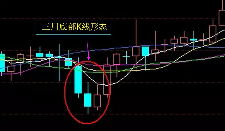 三川底部K線形態(tài)有什么樣的特征?首先,名字上看的話,該形態(tài)就是要處在低位,而且第一根K線應是實體較長且?guī)в休^長下影的陰線;其次第二條K線是一條陰線,要求向上跳空開盤,實體比較小,而且還要帶有較長的下影線,并且最低價要低于前一陰線的最低價。最后第三條K線是一條孕育在前一根K線下影線中的小陽線,最低價應該比前兩條線的最低價要高出許多。如下圖所示。