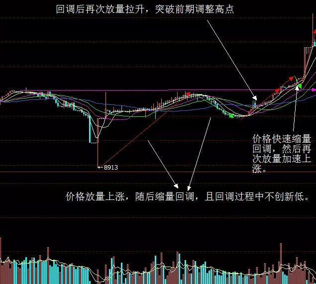 1、 價格放量上漲,然后回調時不能創(chuàng)新低,再次上行的時候量能重新放大。