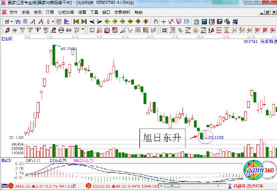 上圖是光華科技在2016年1月份的走勢(shì)圖,圖中我們可以看到該股在1月28日和29日形成了典型的旭日東升信號(hào),我們?cè)谟^察該形態(tài)的話,它是在經(jīng)過(guò)了大幅度的連續(xù)下跌之后,在底部出現(xiàn)的,在出現(xiàn)該形態(tài)之后,股價(jià)開始進(jìn)行上漲,顯然是一種非常符合標(biāo)準(zhǔn)的見底回升形態(tài)。