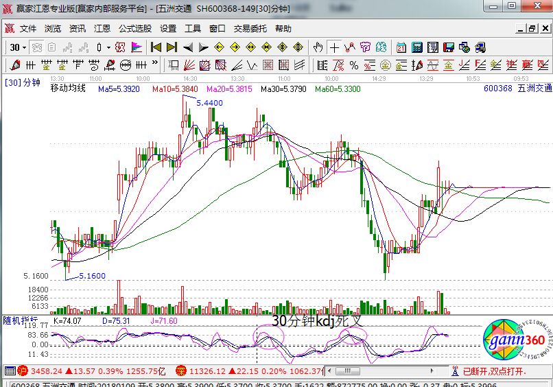 ?、軓募夹g(shù)面上分析的話,當(dāng)天不能漲停,或者30分鐘和60分鐘的kdj在高位形成死叉(如下面的五洲交通走勢(shì)圖),投資者都應(yīng)該進(jìn)行清倉(cāng)出局了。