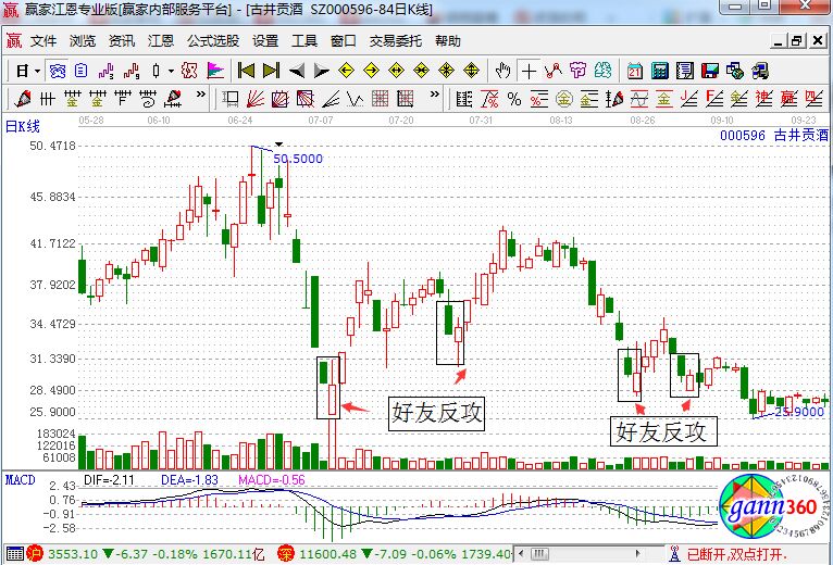 在8月24日、25日和9月1日、9月2日的時(shí)候,股價(jià)有出現(xiàn)了兩次好友反攻形態(tài),股價(jià)也是短暫反彈后繼續(xù)往下跌。顯然這樣的好友反攻形態(tài),僅僅具有短期指導(dǎo)意義。