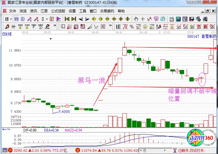香雪制藥在2012年7月份的走勢(shì)圖中,我們可以看到該股在7月12日的時(shí)候回調(diào)到一浪中間位的時(shí)候,有了止跌的信號(hào),在接下來(lái)的一天走勢(shì)中,該股放量上攻,這就是一個(gè)明顯的啟動(dòng)信號(hào),所以符合了上面的黑馬三浪的走勢(shì)案例。