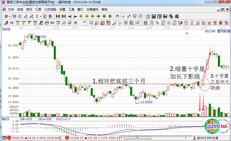 星網(wǎng)銳捷在2016年1月至4月份的走勢橫盤了3個月,顯然符合了第一個條件,在即將拉升的時候出現(xiàn)了縮量的十字星,而且下影線是比較長的,所以符合第二三條件,在十字星次日走出了中大陽線,顯然是符合第三個條件。