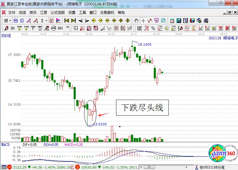 策略3、下跌盡頭線可以讓投資者有柳暗花明走勢,但是作為轉(zhuǎn)勢信號判斷依據(jù),成功率并不能達(dá)成百分之百,很多投資者還是要根據(jù)它所處的具體位置或者綜合額贏家江恩特色指標(biāo)來進(jìn)行研判的。