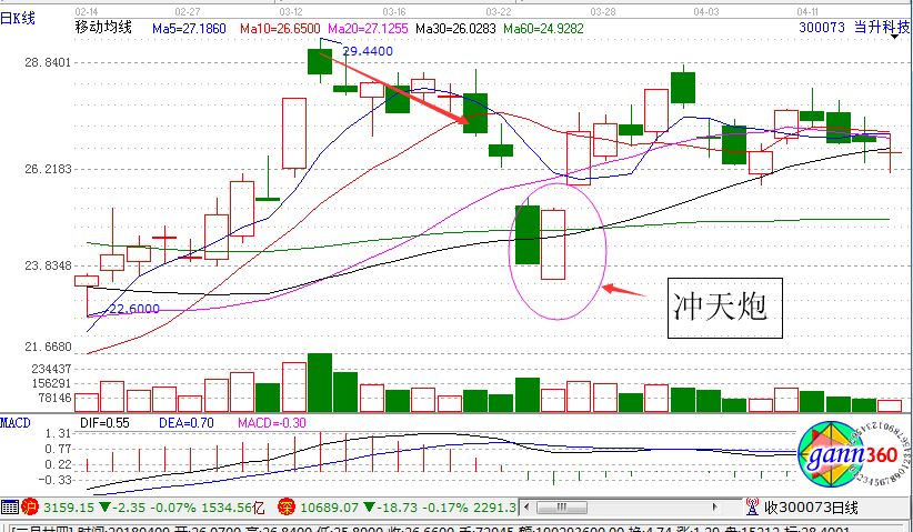 條件3、沖天炮呈現(xiàn)后,第二天就可以買入了,止損點(diǎn)可以設(shè)在沖天炮當(dāng)天的最低價(jià),破掉的話就有可能是失敗的;