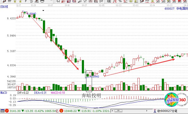 棄暗投明形態(tài)的名稱是怎么來(lái)的呢?它其實(shí)指的就是:K線下跌后的相對(duì)低位,或者盤整區(qū)域,或者上升趨勢(shì)的波段回調(diào)中,意味著多頭勢(shì)力的起步,空頭勢(shì)力的衰竭,K線將會(huì)上漲,所以投資者應(yīng)當(dāng)放棄之前下跌的判斷,轉(zhuǎn)為上漲,所以稱棄暗投明。接下來(lái)我們就以華電國(guó)際的為例來(lái)為大家講解該形態(tài)的要點(diǎn)。