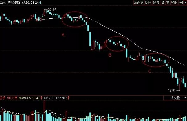 上圖是鄂爾多斯股票軟件中歷史上部分日K線走勢圖,從圖中我們可以看到,該股先是高開,然后開始在高位震蕩盤整。在A處,股價出現(xiàn)了綿綿陰跌的看跌信號,股價快速下跌杭州,又開始反彈,但反彈比較弱,隨后又出現(xiàn)綿綿陰跌形看跌信號,即B處。雖然股價已經(jīng)下跌了很多,但是還是要進(jìn)行出局的,否則就會被套的更深,在C處股價先是橫向盤整,然后又出現(xiàn)綿綿陰跌形看跌信號,此時投資者應(yīng)清倉出局,短時間內(nèi)不要碰該股票為好。