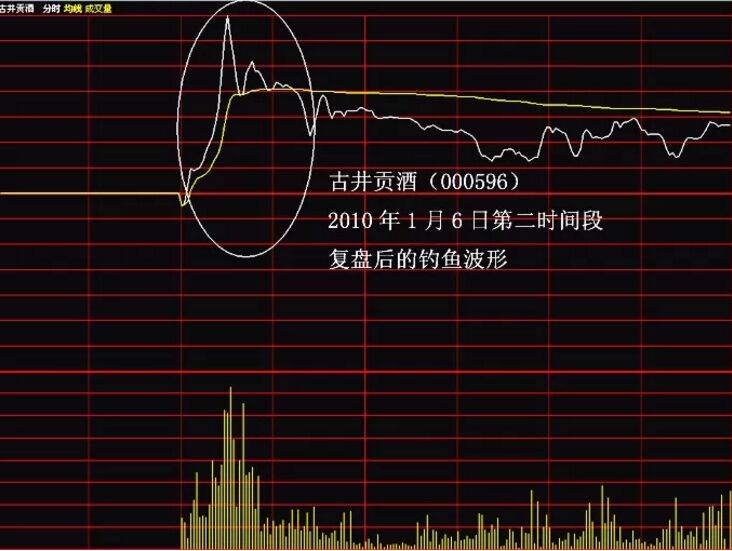 股票釣魚波是怎么樣的?它其實(shí)指的就是股價(jià)在盤中拉升過程中弧線幾乎垂直式跳水下跌的波動(dòng)特征,因這一波動(dòng)特征而形成的即時(shí)波形就是“釣魚波”。由于該形態(tài)出現(xiàn)前,股價(jià)呈現(xiàn)長波攻擊性拉高特征,當(dāng)股價(jià)漲至一定高位時(shí),盤中突然跳水,其形態(tài)就像釣魚姿態(tài),故此得名。如下面的古井貢酒的分時(shí)走勢圖。