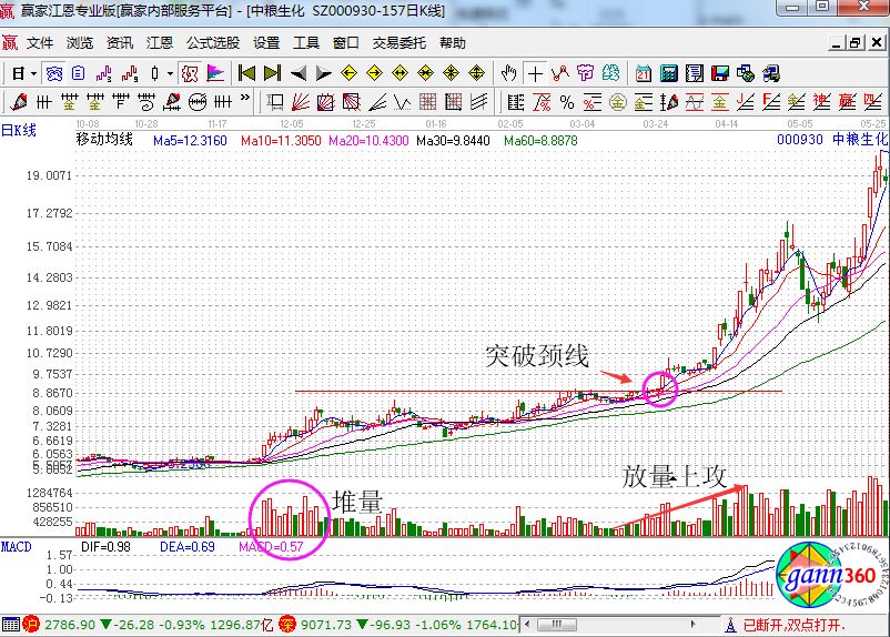 如上圖所示,這只股票幾乎都是沿著五日線上攻,而且陽(yáng)量是大于陰量的,依據(jù)量能可進(jìn)行高拋低吸,依然不要忘記不要輕易的離場(chǎng),以五日線作為生命線就可以。