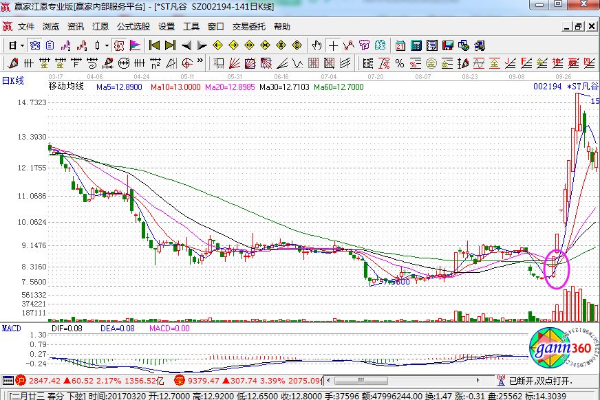 底部首板是怎么樣的?它其實指的就是股價處于股票的歷史走勢中的相對低位,首個交易日漲停就是底部首板。研究底部首板對于我們在交易過程中抓強勢股是非常重要的。例如*st凡谷在2017年9月份的走勢圖。