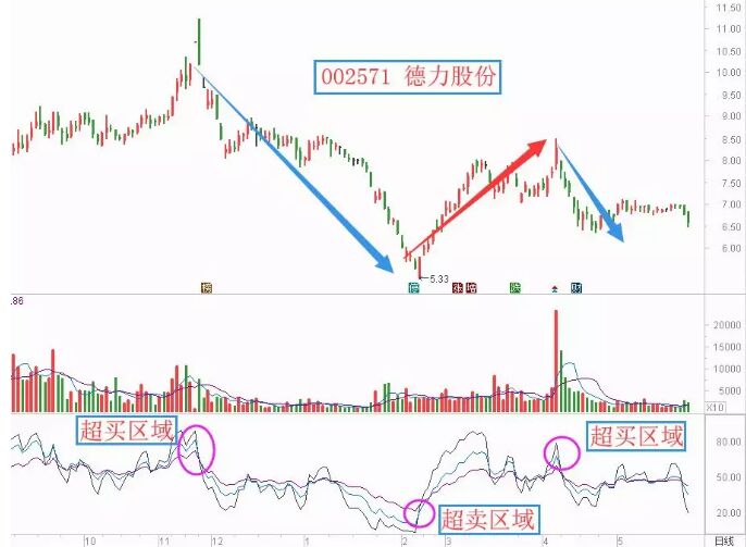 同其他常用的指標一樣,該指標是有數(shù)值的劃分的。最基本的就是:當RSI的值大于50的時候是強勢市場,高于80以上則進入到了超買區(qū)域,股價在超買區(qū)域容易形成短期的調(diào)整;小于50為弱勢市場,低于20以下進入超賣區(qū)域,股價在超賣區(qū)域容易形成短期的反彈。如下面的德力股份走勢圖。