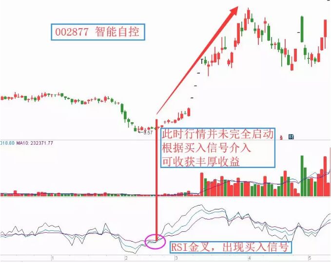 這個指標是有三條線所組成的,有一條長期的,兩條短期的,如果短期RSI大于長期RSI為多頭市場,反之的話就是空頭市場。短期RSI在20以內(nèi)下超賣區(qū)域內(nèi),由下往上交叉長期RSI時間,是買入信號(如下面的智能自控),短期RSI在80以上超買區(qū)域內(nèi),由上往下交叉長期RSI時,為賣出信號。