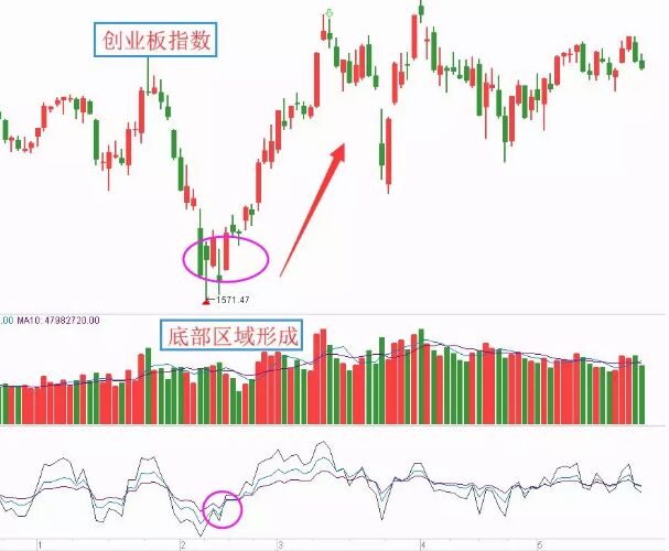 形態(tài)不僅在K線上可以運用,在RSI指標分析中,也能夠進行大量的運用,可以依據(jù)超買區(qū)和超賣區(qū)的頭肩頂或底、雙頭或底等反轉(zhuǎn)形態(tài)來進行買賣的判定,如下面的創(chuàng)業(yè)板指數(shù)走勢。
