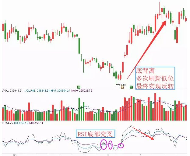 股價一波比一波底,相反的RSI卻一波比一波高,這就是先行的底背離,股價很容易形成反轉(zhuǎn)上漲的走勢,如下面的圖形所示。相反地,如果股價一波比一波高,該指標一波比一波低,那么這個時候就是頂背離,此時股價就容易出現(xiàn)反轉(zhuǎn)下跌。