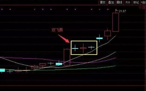 “雙飛燕”形態(tài)是一種K線技術(shù)形狀,走勢上出現(xiàn)大陽之后兩根并排上揚成交量和振幅逐步遞減的十字星,而且均線系統(tǒng)通常是以完美的多頭排列列示,股價沿著10日均線強勁攀升。當(dāng)“雙飛燕”形態(tài)形態(tài)出現(xiàn)之后,股價一般大概率上是上行的,從這個意義上來說,該形態(tài)還有這推測頂部的功能,要注意該形態(tài)的位置,位置低,期望值就可大些,如果位置高,期望值就要小些,而且隨時準(zhǔn)備清倉離場。如下圖所示。