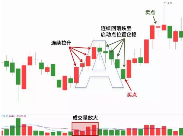“A字”戰(zhàn)法是怎么樣的?它指的就是股票K線走出一個類似A字的形態(tài),即個股先經(jīng)過了主力資金搶籌,之后持續(xù)上漲,然后是展開了一波的拉升行情,緊接著隨著短線資金獲利出局,主力順勢洗盤,股價隨后進(jìn)行回落,并跌至啟動點的位置。A字戰(zhàn)法的圖形如下。