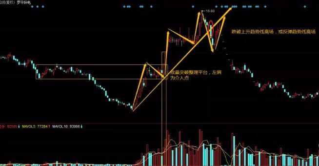 1、 連續(xù)拉升到左肩平臺隨后出現(xiàn)整理,放量大陽線突破平臺整理為介入點;