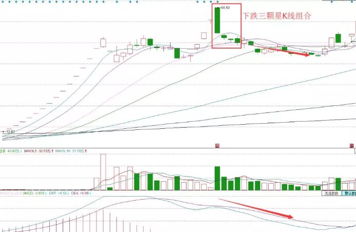 2、 如果在下跌末期出現(xiàn)下跌三顆星,則要通過多種角度來分析,如均線系統(tǒng)、指標(biāo)、量價關(guān)系來進(jìn)行綜合分析,是否會止跌反彈。