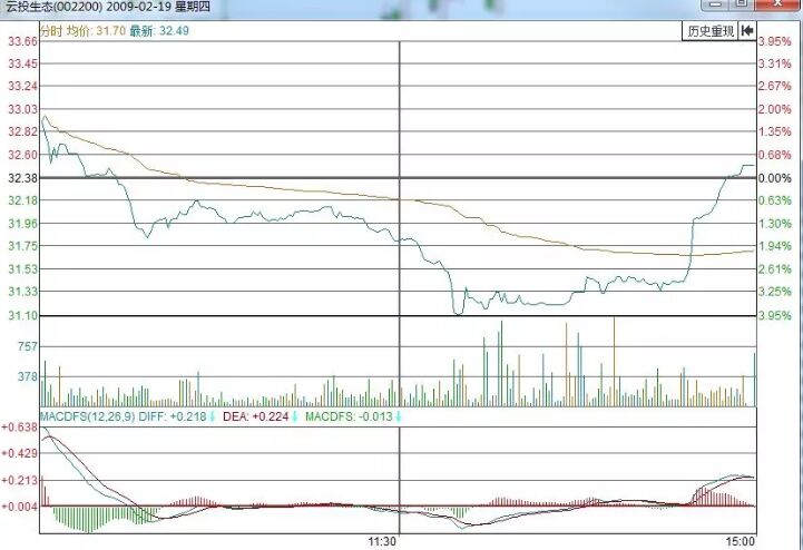 上面是云投生態(tài)的日K線走勢(shì)圖,從這張走勢(shì)圖中我們可以看到:股價(jià)上漲過程中突然面臨下跌的威脅,突如其來的連續(xù)兩天放量下跌打破了上升的趨勢(shì)。就在投資者絕望之時(shí)間,第三日股價(jià)高開高走,盤中跌幅一度是達(dá)到了4%,但是在收盤的前半小時(shí)內(nèi)股價(jià)居然起死回生般上漲了,單日股價(jià)收于32.49元/股,小腹上漲0.34%。下面就是該股在當(dāng)時(shí)的分時(shí)走勢(shì)圖。