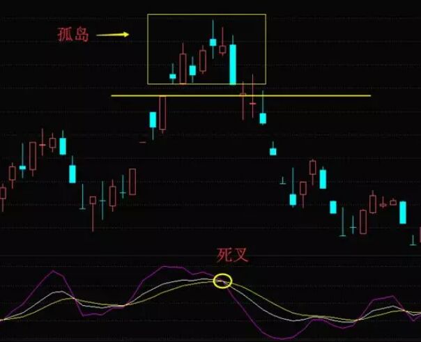 除此之外,我們參考一下幅圖指標(biāo)KDJ,島型形態(tài)形態(tài)之后,該指標(biāo)顯示股價處于超買狀態(tài),拐頭向下,形成死叉,則更可確認(rèn)后市下跌的走勢。