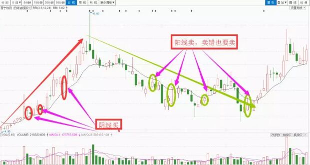 陰陽線戰(zhàn)法的具體步驟為:第①步,選擇上升趨勢良好的個股;第②步,線上陰線買;第③步:線下陽線賣。