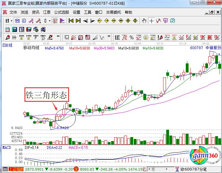 均線鐵三角形態(tài)是什么?它其實(shí)指的就是5日均線由下向上先后金叉10日均線、30日均線,10日均線再金叉30日均線,這三條均線圍成一個(gè)三角形態(tài)。如下面的中儲股份走勢圖。
