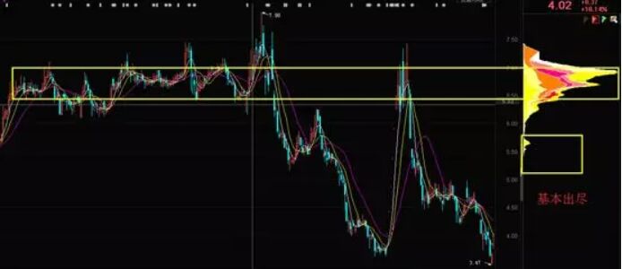 如上圖所示,股價后期又被拉升起來,但是也并沒有再創(chuàng)出多么靚麗的新高,是因為有的主力資金被套了,因此主力進行自救,將K線拉回高位。此后K線在這個位置進行了高位震蕩,是因為主力在這個過程中逐步出貨,知道主力貨物基本出盡。如下圖所示,當(dāng)籌碼都在高位時,說明主力跑的差不多了,后期股價就難以繼續(xù)上漲,而是開始下跌了。