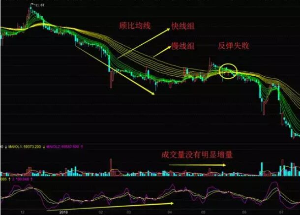 其后,K線果然開始止跌盤整,后市開始慢慢回升顧比均線快線組開始上穿慢線組,其中3、5、8線突破慢線組,但是不就就出現(xiàn)跌破慢線組,多頭很快的湮滅,顯示反彈那失敗。