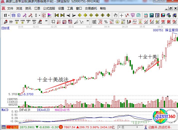 這是鋅業(yè)股份000751在2015年2月份至5月份的走勢圖,從圖中可以看到:該股從當(dāng)年的2月9日開始小陽線拉升,拉個(gè)8根小陽線后小陰小陽線繼續(xù)向上,一只都是按照一定的傾斜度向上,到了3月23日小幅的盤整之后,開始一波幾十點(diǎn)的上揚(yáng)。到了2015年5月19日開始有連續(xù)拉出八根陽線,調(diào)整后又一波大幅上漲。