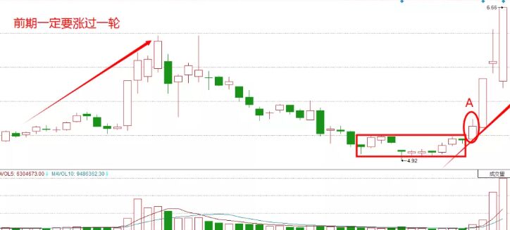 上圖是日出東方的部分截圖,從圖中我們可以看到該股出現(xiàn)了一輪上漲式的行情,并且漲幅在20個(gè)點(diǎn)左右,當(dāng)大陽(yáng)線出來(lái)后,指數(shù)再次拉升之后肯定會(huì)有很多跟風(fēng)盤(pán),我們看到主力再創(chuàng)出近期新高之后以非??焖俚姆绞酱蠓盏烷_(kāi),隨后就開(kāi)始一系列宰殺行為,不斷的有跳空小陰線形成明顯的挖坑行情,隨著一連串小碎陽(yáng)的出現(xiàn)走出了一個(gè)箱體運(yùn)行,同時(shí)下方的量能是出現(xiàn)了近期的地量行情,隨著A點(diǎn)的有效突破箱體上沿,同時(shí)下方出現(xiàn)了小倍陽(yáng)的量能增加走勢(shì),因此這個(gè)突破點(diǎn)A就是我們進(jìn)場(chǎng)的好時(shí)機(jī),可以享受到后期拉漲的快感。