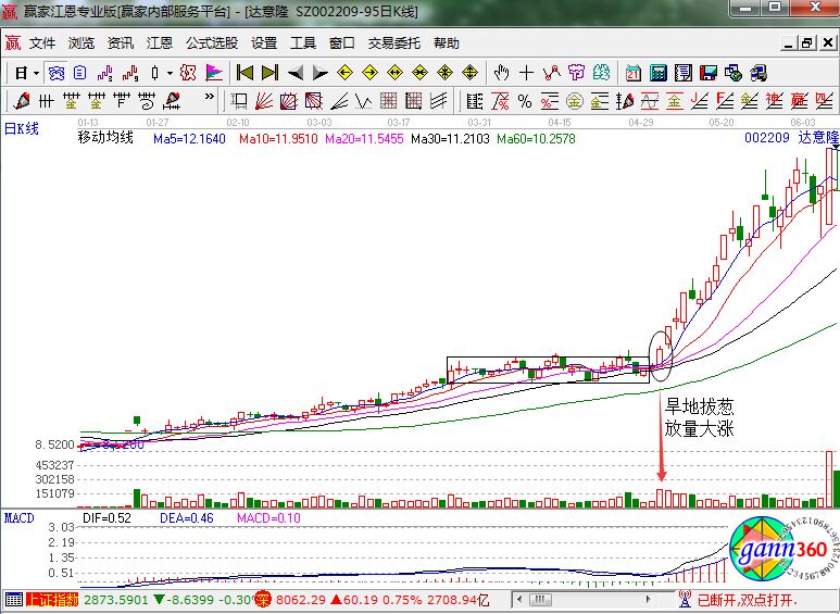 在大多數(shù)情況下,出現(xiàn)旱地拔蔥形態(tài)的漲幅會(huì)操作30%,而且這個(gè)時(shí)候通常會(huì)伴隨著macd等指標(biāo)的出現(xiàn)金叉或者明顯向上走的走勢。