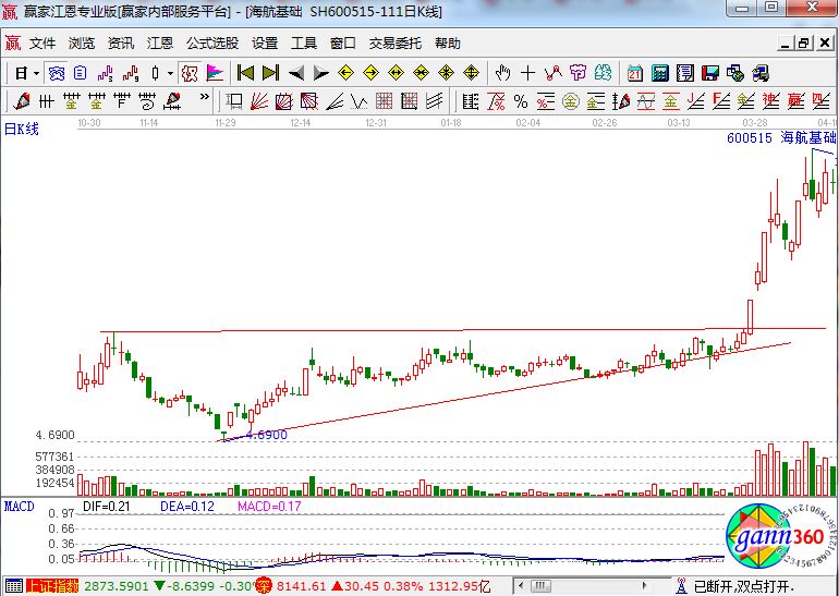 臨門一擊形態(tài)有什么樣的特征?它的主要特征為:盤整時間比較長,中間會出現(xiàn)3到4次波段位拉伸高點,在上軌壓力線處遇阻回落。表象形態(tài)億矩形、三角形、旗形是最常見的。突破之前的盤整形態(tài)多數(shù)表現(xiàn)為縮量運行。突破后回踩,觀察是否出現(xiàn)止跌K線,多數(shù)為二次低吸信號。下面我們就來看航?;A的歷史走勢圖。