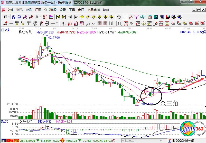 我們來看柘中股份的日K線走勢圖,從圖中我們可以看到該股的低位形成了一個(gè)金三角金叉,但是盈利空間來看,本段行情形成后的漲幅有30%多,不算太多,但是和當(dāng)時(shí)其他股票來比較,利潤還是比較的客觀。如上圖所示,在一輪震蕩下跌后,行情開始低位出現(xiàn)幾根陽線,然后5日均線迅速的穿過10日和20日線,這個(gè)時(shí)候10日線也震蕩攀升穿過20日線。終于,行情在較低位置形成一個(gè)金三角。暗示后市行情將會(huì)有較大漲幅,此階段進(jìn)場最佳。