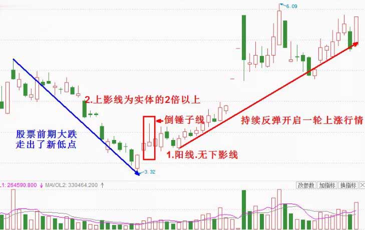 2、 倒錘子線最好實(shí)體為陽線最佳,當(dāng)日個(gè)股情況也可以是陰線。