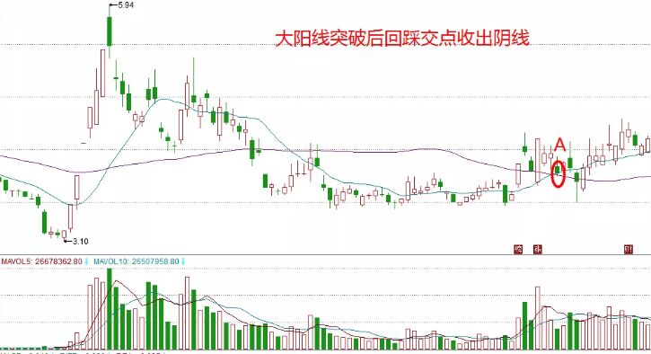 隨著回踩到了13日和55日均線(xiàn)的交點(diǎn)A點(diǎn)處收出了一根陰線(xiàn),同時(shí)下方的量能顯示這是個(gè)縮量回調(diào)但是這個(gè)時(shí)候我們不能輕易介入,要觀察一下后面幾天的走勢(shì)。圖中A點(diǎn)出現(xiàn)不久一根帶有長(zhǎng)上影線(xiàn)的影響出現(xiàn),同時(shí)這根K線(xiàn)的最高點(diǎn)就是前一根突破行情的大陽(yáng)線(xiàn)最高點(diǎn),可以是一個(gè)壓力位,隨著第二天一根帶有長(zhǎng)上影線(xiàn)的陰線(xiàn)出現(xiàn),這就是值得我們重點(diǎn)關(guān)注的。