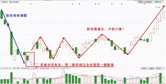 1、 九陽股份。下面是該股在歷史上的部分截圖,從屠宗我們可以看到,股價前期持續(xù)下跌調整,在底部出現(xiàn)了看漲吞沒的K線組合,隨后出現(xiàn)震蕩,開啟了主升浪。