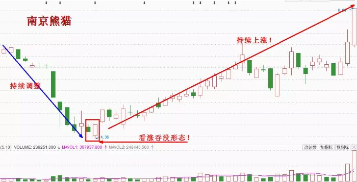 2、南京熊貓。下圖是南京熊貓在歷史上的部分截圖,這只股票同樣在下跌調整的底部出現(xiàn)可看漲吞沒形態(tài),隨后股價也進入到了主升浪部分,這樣就能夠收獲非常不錯的利潤。