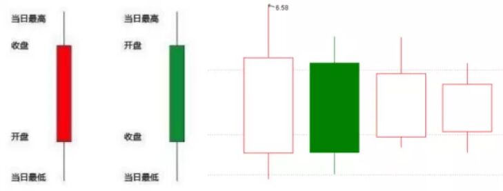 打開股票軟件,調出K線圖,每一根K線都含有開盤價、最高價、最低價和收盤價。而開盤價和收盤價之間稱為實體。相應的圖形如下。