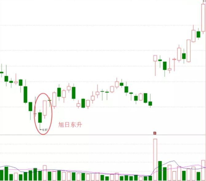 3、旭日東升。此形態(tài)出現(xiàn)在下跌途中,有兩根K線組成,是喲中陰線加上高開中陽線組成,并且陽線收盤價高于陰線開盤價,這樣的走勢就有看漲的意義,如下圖所示。