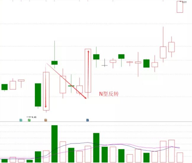 5、N型反轉。此形態(tài)出現(xiàn)在上漲的途中,是由大小不等的多根K線所組成,即大陽線加上若干小陰線在加上大陽線所組成?;卣{陽線組沒有跌破第一根陽線開盤價,具有看漲意義,如下面的圖形所示。