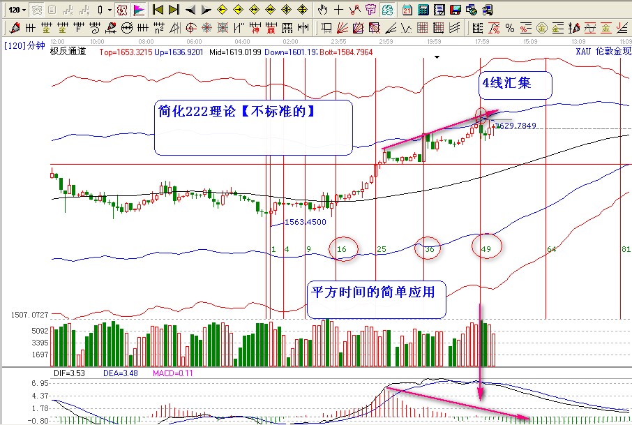 第3個(gè)就是平方時(shí)間:平方時(shí)間循環(huán)線;4【2*2】9【3*3】16【4*4】25【5*5】36【6*6】49【7*7】我們從圖中可以清楚的看到黃金在16 的時(shí)間站上生命線然后一路飆升,直到遇到36時(shí)間拉出一個(gè)大陽(yáng)線后遇到極反通道上軌壓力經(jīng)行了一個(gè)震蕩盤(pán)。在49時(shí)間極反通道上軌壓力再次遇阻回路,并且收出了一個(gè)大陰線。再次證明了時(shí)間的神奇之處。