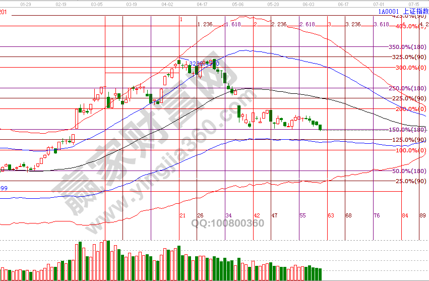 江恩理論中有一條分析規(guī)則四次遇阻力(支撐)而破,價格分析中波段百分比延伸線1倍循環(huán)180度2834點,指數(shù)按規(guī)則第四次觸碰時擊破,結(jié)合趨勢判斷,極反通道藍(lán)色下軌線是止跌重要參考線。按歷史規(guī)律,市場不同階段的重要拐點均在極反通道5條線上,盤中擊破2834點時,贏家江恩技術(shù)服務(wù)團(tuán)隊在VIP學(xué)員群中談到,4月22號提示風(fēng)險帶領(lǐng)大家減倉轉(zhuǎn)入休息,5月份二次在2840點是高風(fēng)險者分批博弈,應(yīng)用區(qū)間交易法均獲得利潤。市場下破2834點,延續(xù)調(diào)整是低風(fēng)險者空倉或輕倉者的機會,市場走勢是有規(guī)律可循,而贏家江恩系統(tǒng)中極反通道就是一個直觀、有效的判勢工具,用規(guī)則紀(jì)律行事,買在支撐賣在壓力。本周是周線、日線時間窗口共振時間段,跟隨市場觀察是否與價格形成時價四方共振,6月10號盤中壓力是315度2844點、0度2860點,盤中支撐是180度2800、135度2786點。操作策略,指數(shù)擊破黑色生命線進(jìn)入弱勢區(qū)域,整體持倉保持在3-4成,做到進(jìn)可攻退可守。