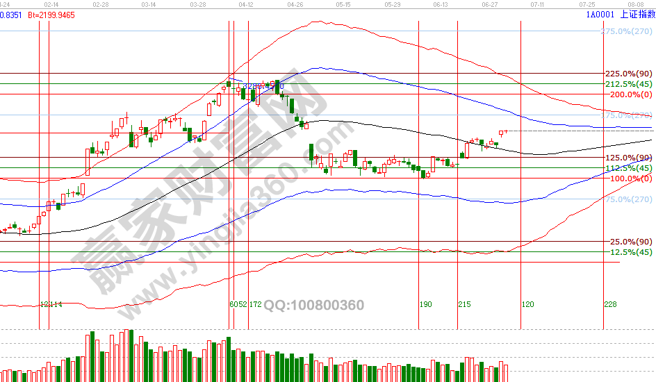 3、4號(hào)是贏家江恩系統(tǒng)時(shí)間周期工具預(yù)判的指數(shù)7月第一個(gè)時(shí)間窗口,周二十字星報(bào)收為近期方向選擇做準(zhǔn)備。1號(hào)大勢(shì)分析中談到,指數(shù)從贏家江恩一直強(qiáng)調(diào)的2840反彈至今已上行200點(diǎn),月線極反通道生命線是3065點(diǎn),此點(diǎn)位同短周期15、30、60分鐘藍(lán)色上軌線形成共振,江恩輪中輪90度3051點(diǎn),兩個(gè)趨勢(shì)工具結(jié)合得出3051-3065是未來(lái)幾天壓力位,此位置相比2840處已不具備大幅開(kāi)新倉(cāng)要求,查看先行指數(shù)上證50日線圖會(huì)更清晰,不開(kāi)新倉(cāng)不代表看空,目前還未出現(xiàn)反彈結(jié)束信號(hào)(謹(jǐn)防極反通道周期共振反壓),提高止賺位保持一定倉(cāng)位持倉(cāng)做應(yīng)對(duì),7月3號(hào)盤(pán)中壓力是135度3055點(diǎn)、180度3067點(diǎn),盤(pán)中支撐是90度3036點(diǎn)、45度3016點(diǎn),今明天是7月第一個(gè)時(shí)間窗口。操作策略,指數(shù)極反通道生命線上安全區(qū)域震蕩上攻,反彈動(dòng)作還在延續(xù),3051-3067區(qū)間附近高倉(cāng)位可以分批兌現(xiàn)利潤(rùn),整體持倉(cāng)保持3-5成。