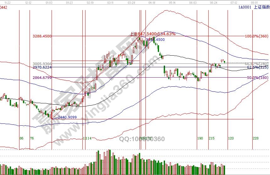 A股3、4號(hào)時(shí)間窗口及3051-3065極反通道多周期共振反壓位,時(shí)間與空間的解讀在6月28號(hào)及1號(hào)在分析中有闡述,同時(shí)今天收盤(pán)價(jià)3015與工具測(cè)算位置僅僅相差一個(gè)點(diǎn)。目前短周期的周期共振警示還沒(méi)有解除,2號(hào)盤(pán)中在贏家江恩系統(tǒng)學(xué)員區(qū)已談到共振會(huì)引起傳遞,目前市場(chǎng)正在按預(yù)期逐級(jí)回踩確認(rèn)短期生命線,回撤期間有參考意義的位置是60分鐘生命線,贏家學(xué)員們可以結(jié)合工具盤(pán)中跟蹤等待信號(hào)確認(rèn)。整體上工具還未給出反彈結(jié)束信號(hào),同時(shí)這里也不具備大幅開(kāi)倉(cāng)條件,提高止賺位保持一定持倉(cāng)做應(yīng)對(duì),7月4號(hào)盤(pán)中壓力是135度3055點(diǎn)、90度3036點(diǎn),盤(pán)中支撐是0度2997點(diǎn)、315度2978點(diǎn)。操作策略,指數(shù)極反通道生命線上安全區(qū)域震蕩上攻,反彈動(dòng)作還在延續(xù),3051-3067區(qū)間附近高倉(cāng)位可以分批兌現(xiàn)利潤(rùn),整體持倉(cāng)保持3-5成。