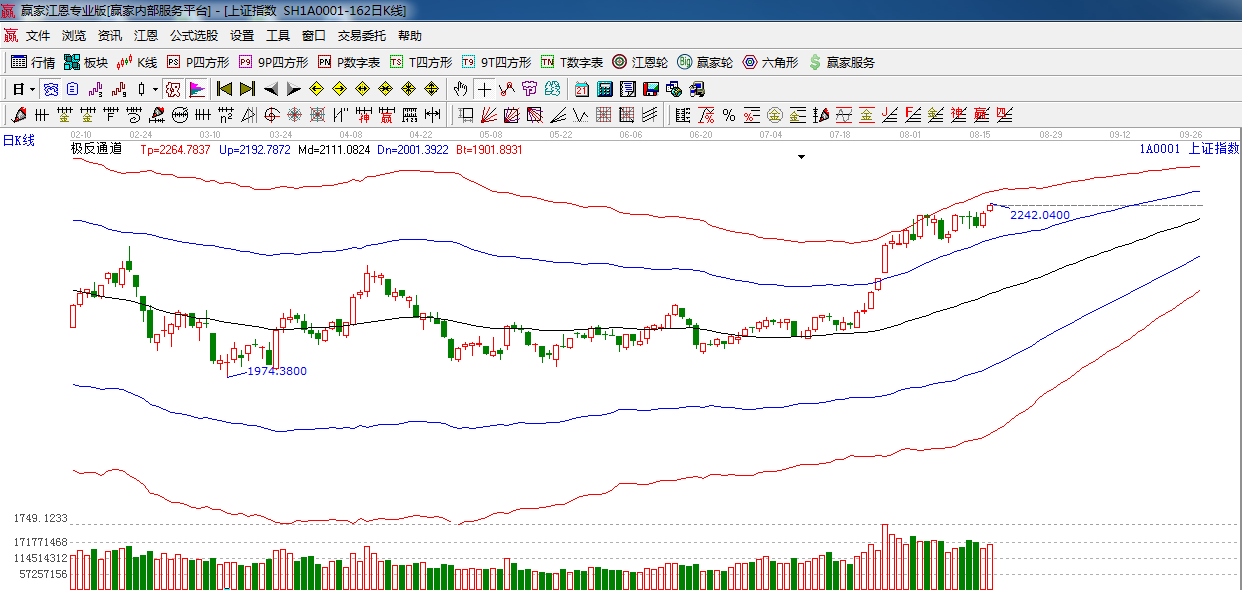 極反通道提示:創(chuàng)出近期新高,極反通道紅色外軌阻力是 2260附近。