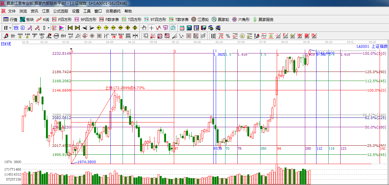 江恩看盤綜述:依據(jù)贏家江恩技術(shù)工具分析得出:指數(shù)高開,突破180度2232點,創(chuàng)出近期新高,題材股活躍,權(quán)重股滯漲,接近2254,2261點,拋壓會越來越重,預(yù)計 周二大盤繼續(xù)高位震蕩。